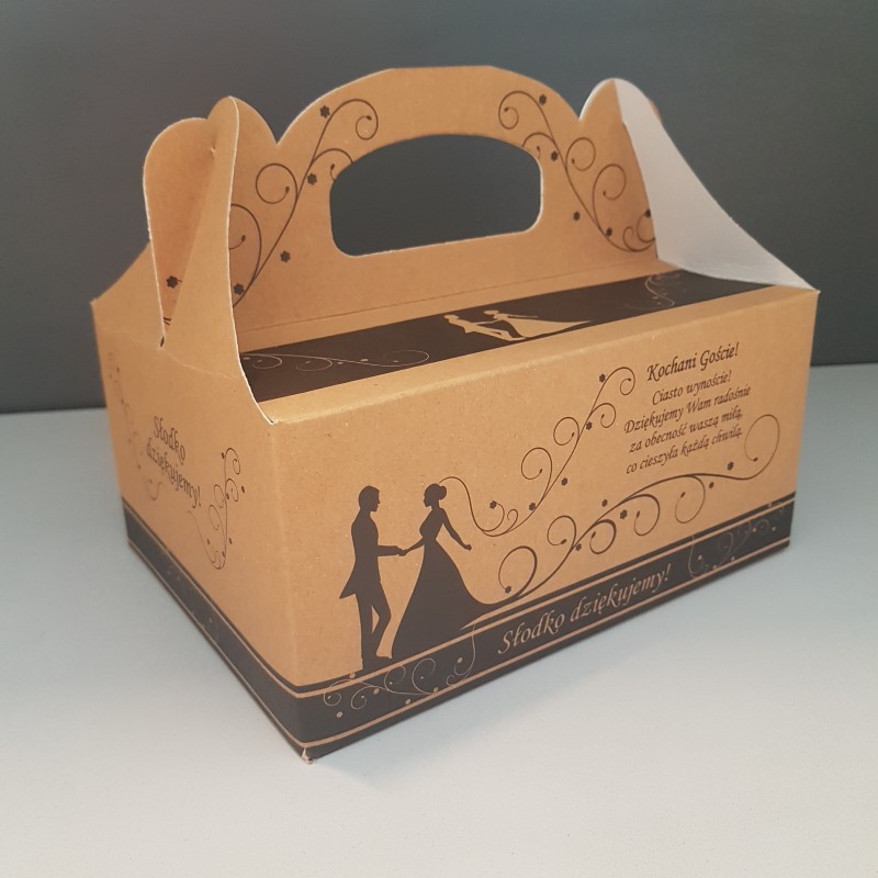 Pudełka samoskładające na ciasto są elegancką formą podziękowań dla gości weselnych lub innego typu imprez okolicznościowych. Występują w różnych wzorach oraz kolorach. Do każdego pudełka dodawana jest podkładka wzmacniająca i usztywniająca dno.