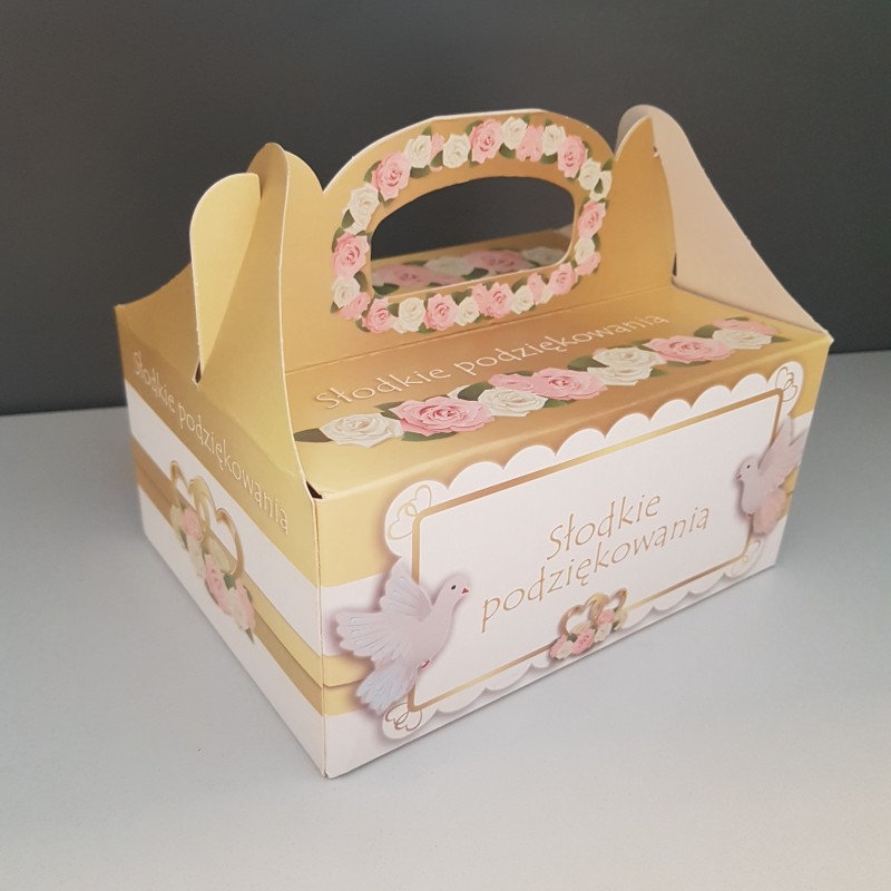 Pudełka samoskładające na ciasto są elegancką formą podziękowań dla gości weselnych lub innego typu imprez okolicznościowych. Występują w różnych wzorach oraz kolorach. Do każdego pudełka dodawana jest podkładka wzmacniająca i usztywniająca dno.