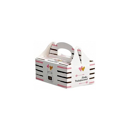 Pudełka samoskładające na ciasto są elegancką formą podziękowań dla gości weselnych lub innego typu imprez okolicznościowych. Występują w różnych wzorach oraz kolorach. Do każdego pudełka dodawana jest podkładka wzmacniająca i usztywniająca dno.